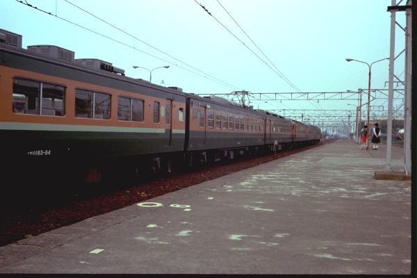 新前橋駅。ホームのとなりが新前橋電車区になっていて、165系の車両基地になっていた。 グリーン車がまだ帯付き塗装で、窓に青い小さな雨樋が付いてます。 (のちにこの黄緑色の帯塗装は廃止されてしまう・・・)